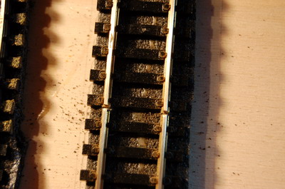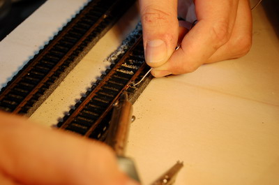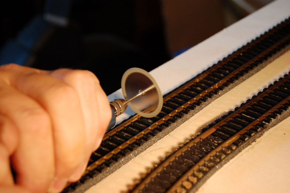 Also musste ein Booster her, hierfür wurde das Gleis in 2 von einander unabhängige Bereiche unterteilt. Dies ließ sich mit einer Diamanttrennschreibe und einem Dremel schnell bewältigen.