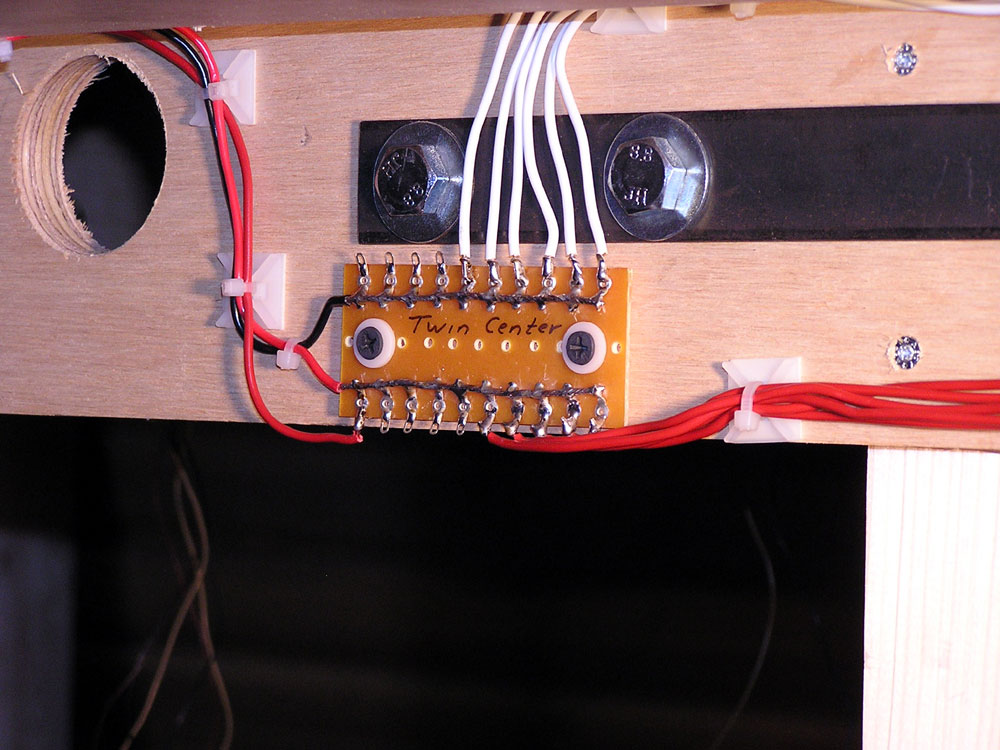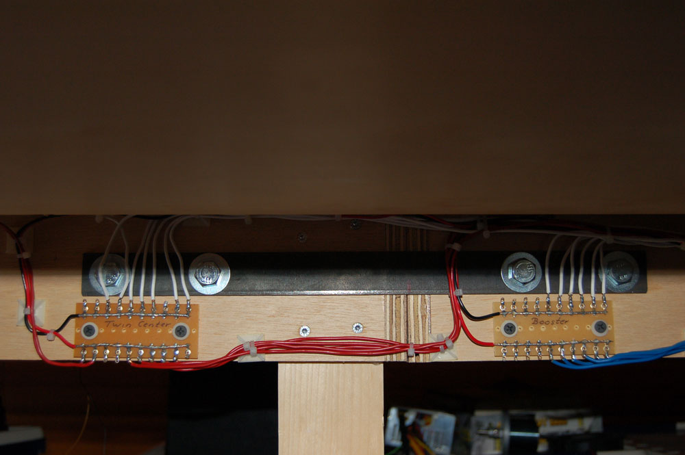 Wir haben ca alle 2-3 Meter den Fahrstrom eingespeist und an einer Verteilerleiste zusammengeführt. Von hier aus geht es dann zum Twin-Center und zum Booster. |