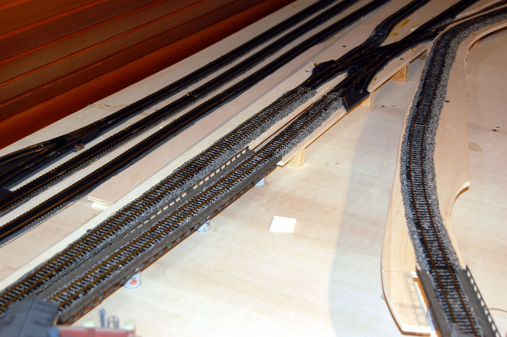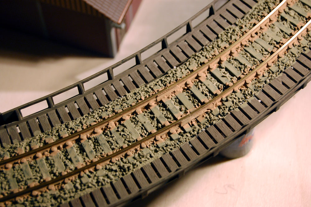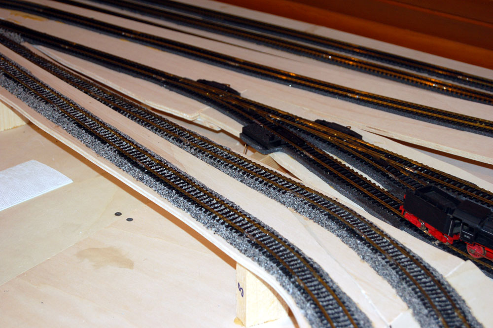 Teilabschnitte sind wie auf diesen Bildern zu sehen, eingeschottert. Zurzeit ist aber Stillstand, weil wir noch einige Abschnitte mit Stromeinspeisung durch einen oder mehrere Booster einplanen müssen. Doch die Teilabschnitte kann man schon mal auf alt trimmen, hierbei gab es später Probleme. (siehe Misserfolge)