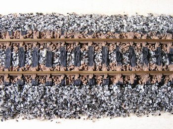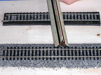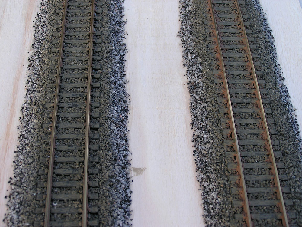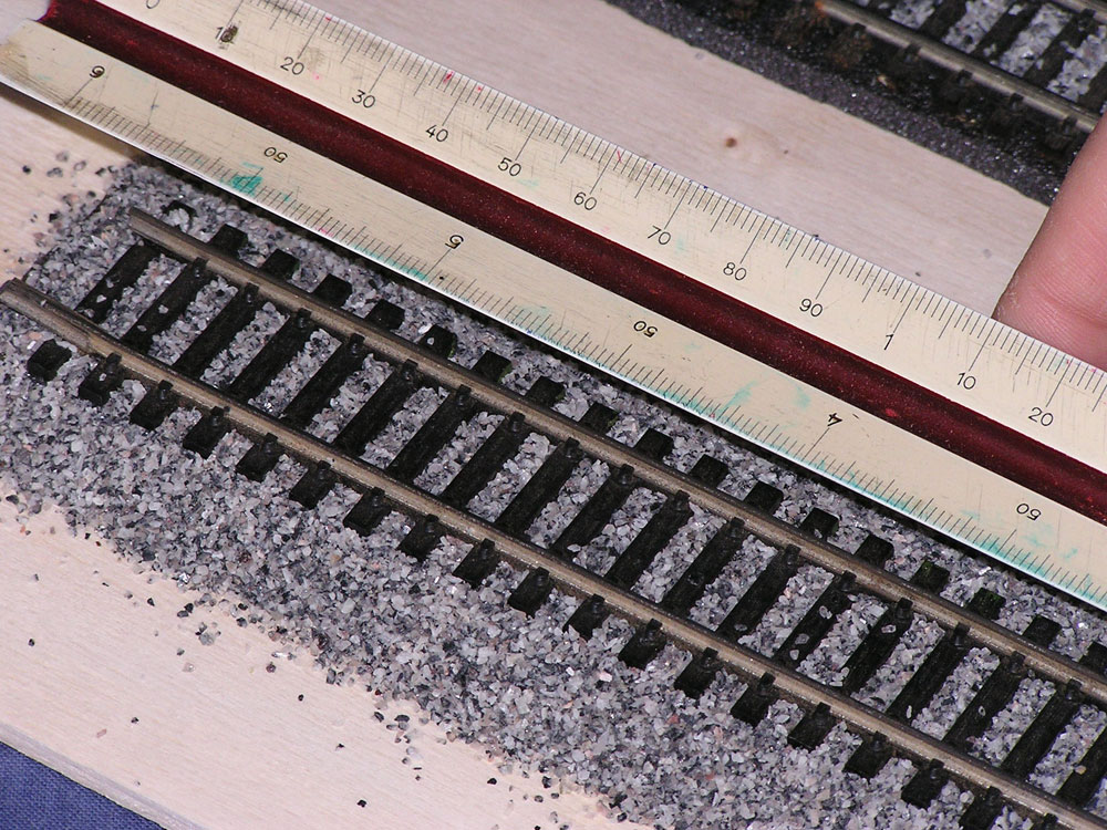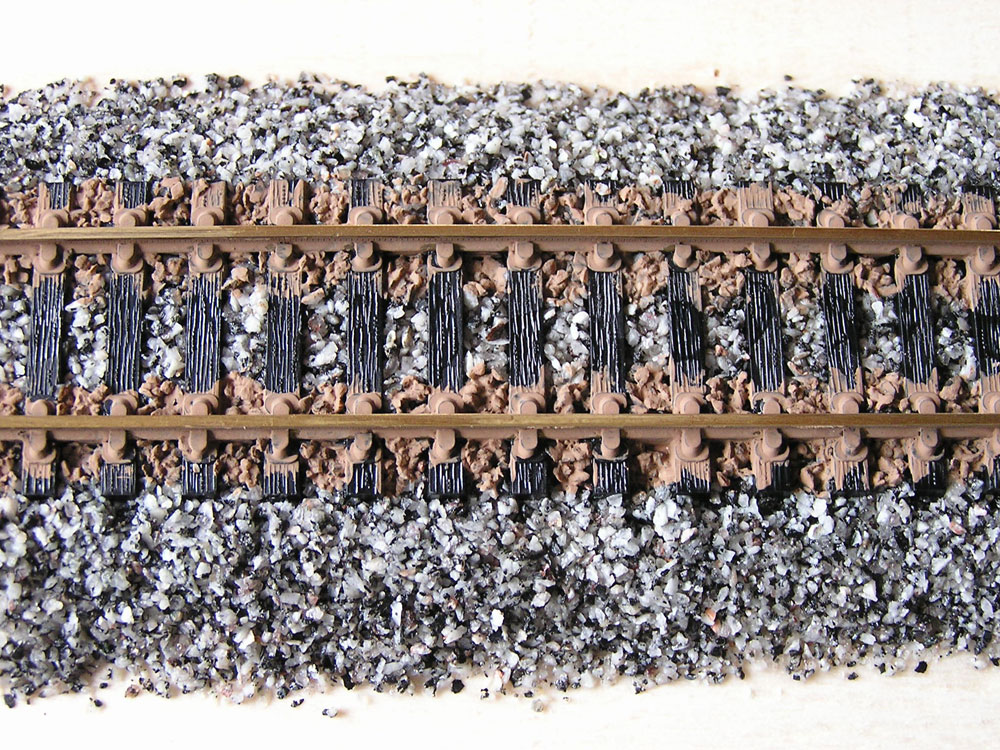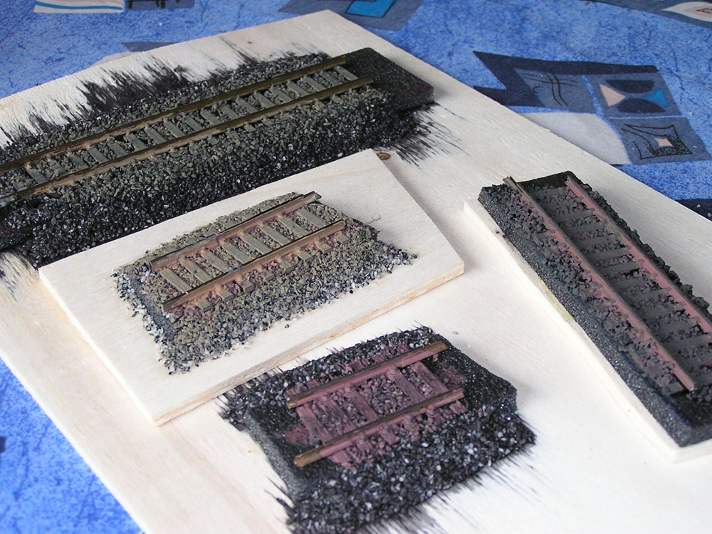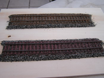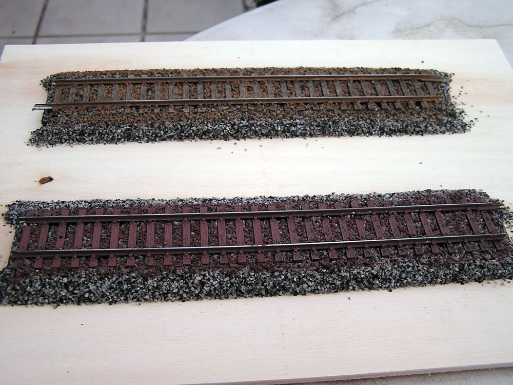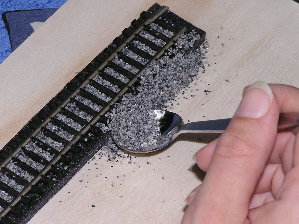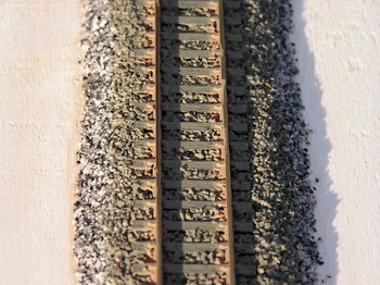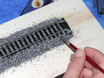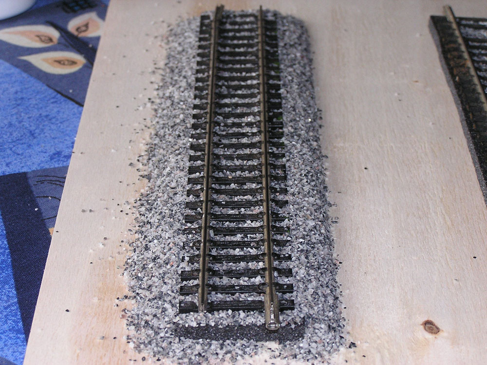 Danach Schotter auf ein Gleis gestreut und mit einem Pinsel in