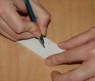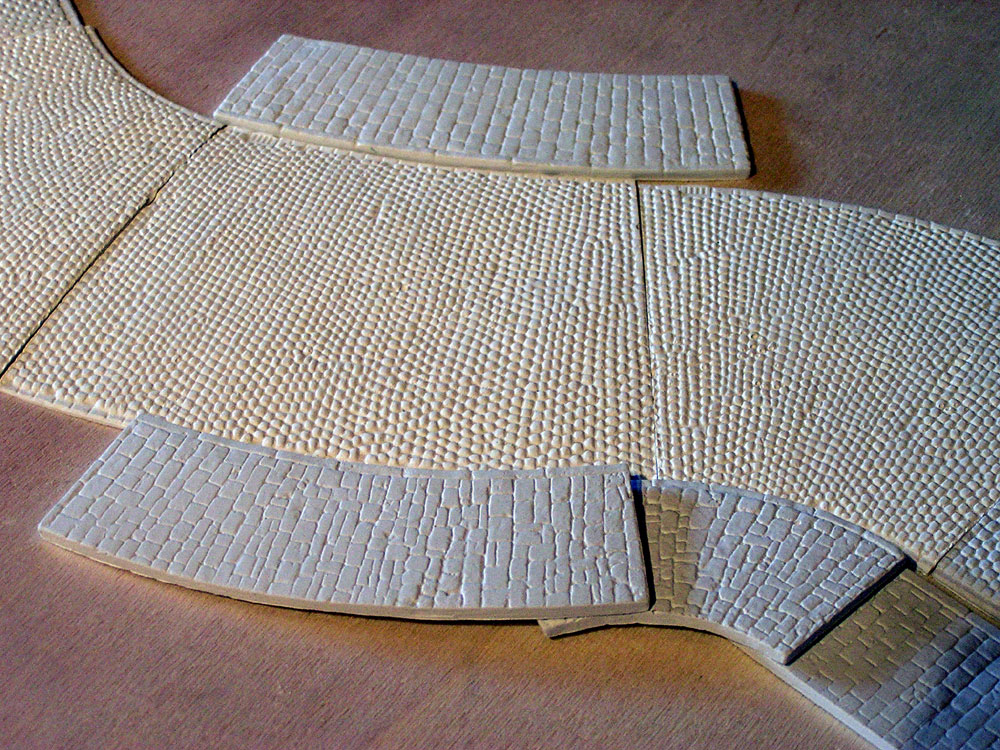 Die getrockneten Gipsteile (hier ein Bürgersteigstück) lassen sich leicht durch ritzen mit einer Reißnadel auf die gewünschte Länge bringen. Eine Straßenteststrecke ist unter dem Punkt "Selbstgemachtes" zu sehen.