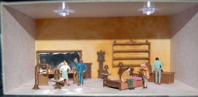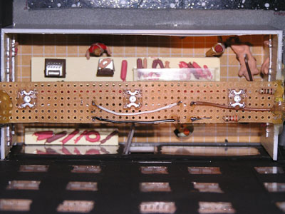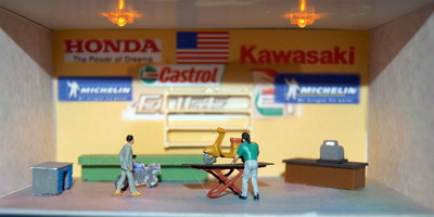 Weil wir die Arkaden zum Leben erwecken wollten, haben wir uns gedacht, aus Pappstücken maßgerechte Einkaufsläden zu basteln. Diese Pappstreifen sind mit Tesafilm und Gewebeband zusammengehalten. Aus altem Bestand hat Sandra noch Möbel und einen Roller zusammengetragen. Daraus entstand ein Moped- und ein Möbelladen.
